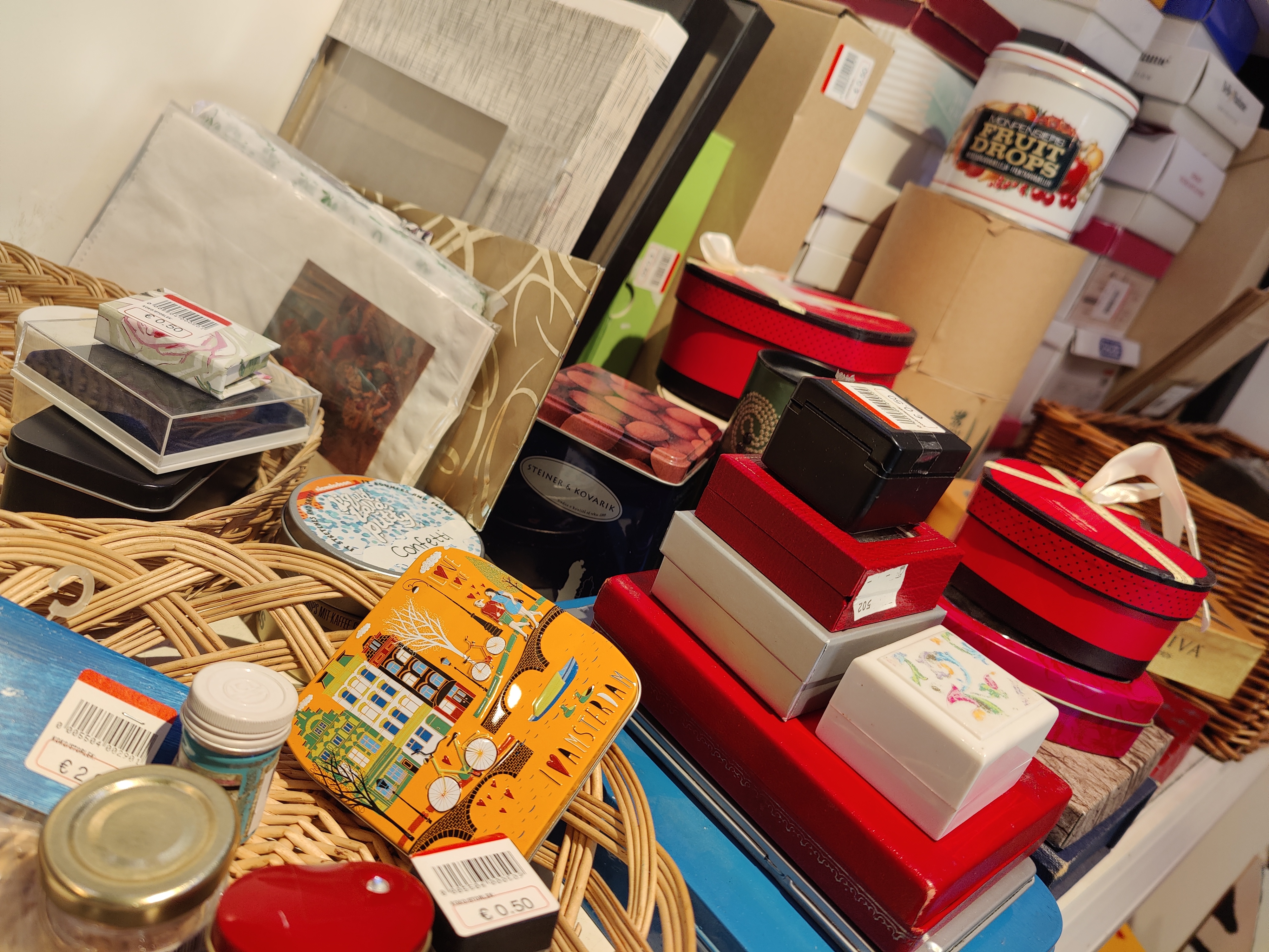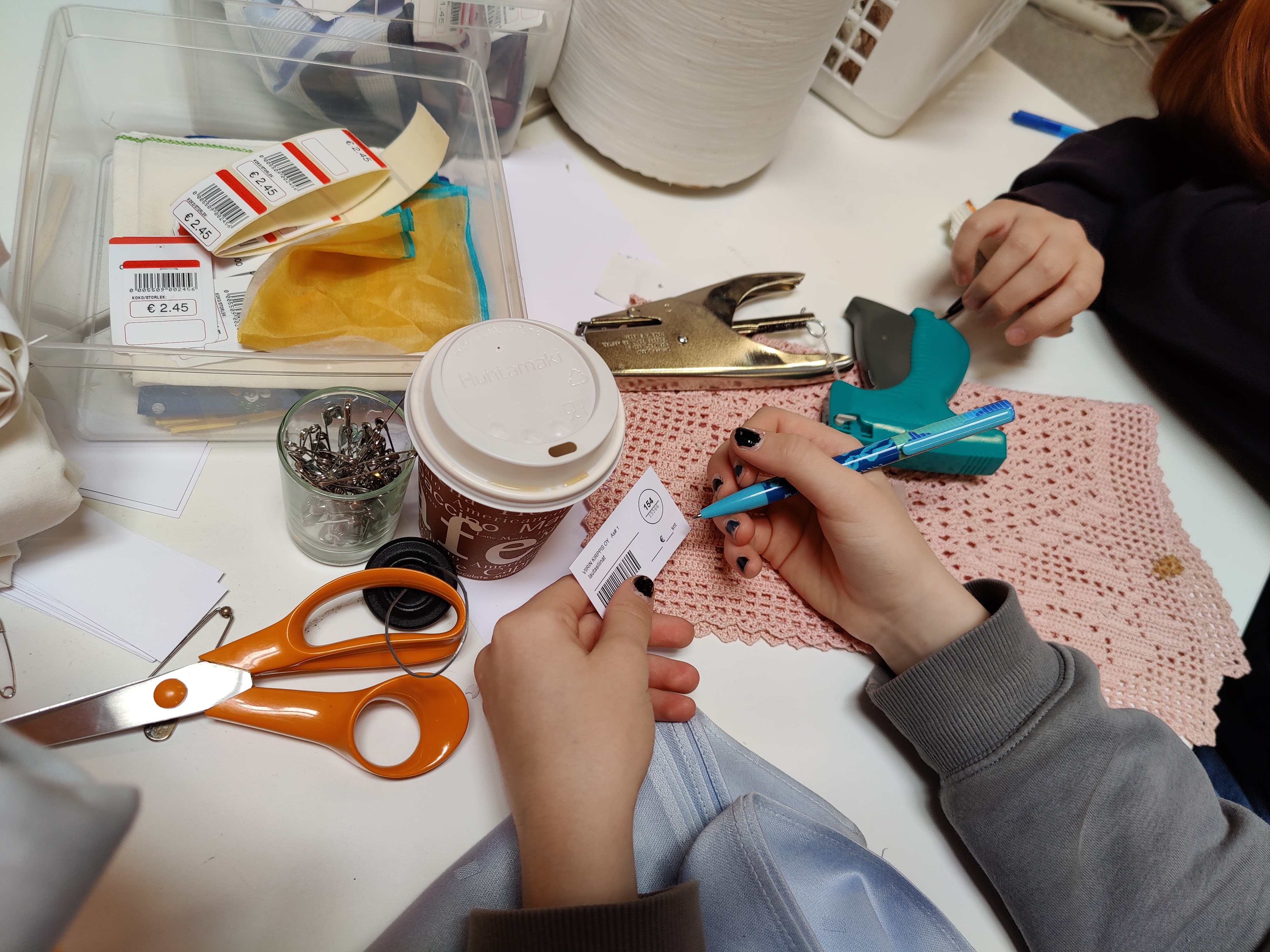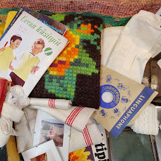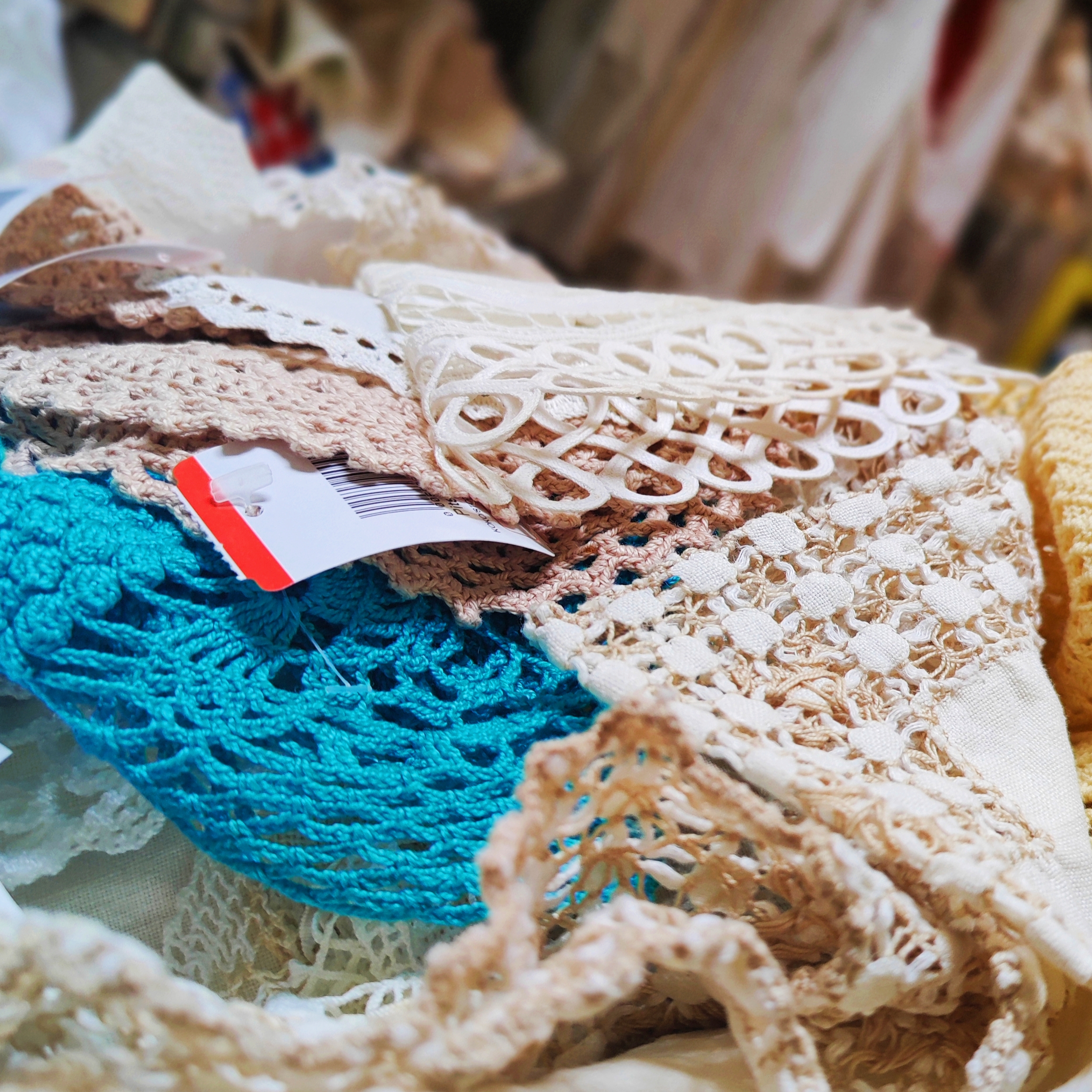 Otamme vastaan kaappien kätköistä käsillä tekemiseen lahjoituksia; kankaita, lankoja, askartelutarvikkeita, naruja, keppejä, vanuja, helmiä ja kaikkea, mistä voi luoda uutta. Lajittelemme ja pakkaamme materiaalit myyntiin. Ompelukoneet ja kaikenlaiset työkalut löytävät myös kauttamme uudet käyttäjät.